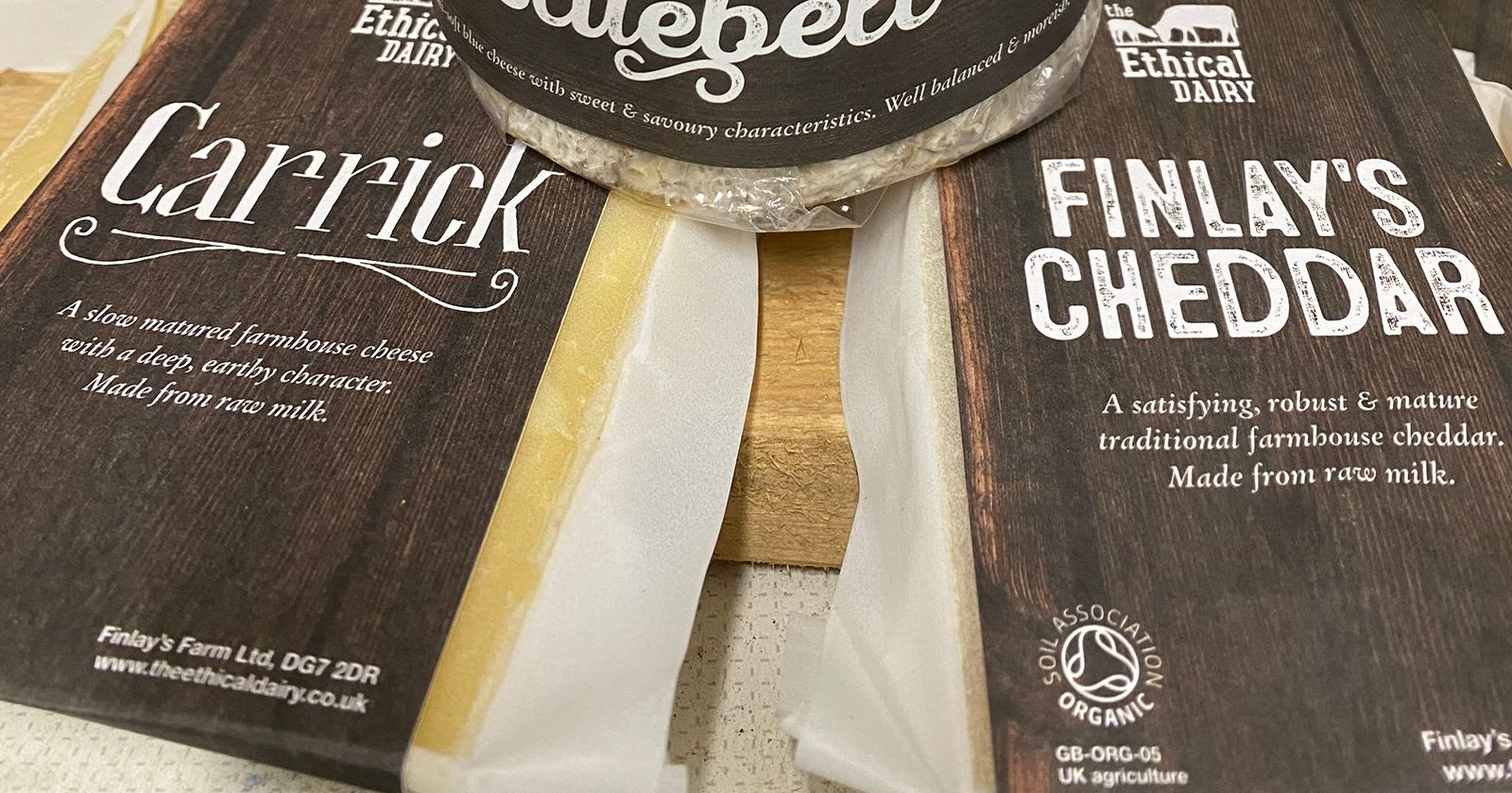 The Ethical Dairy cheeses. Made in South-West Scotland with care for cows, calves, and the land. Rich, full-flavoured cheeses from a farm that is carbon negative and committed to high animal welfare standards.